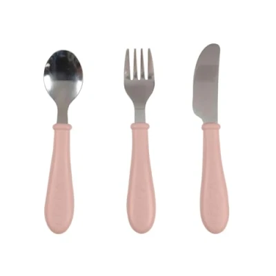 BÉABA, Set of 3 Stainless Steel Learning Cutlery 2nd Stage, from 12 Months, Easy Grip for Baby, Candy Pink