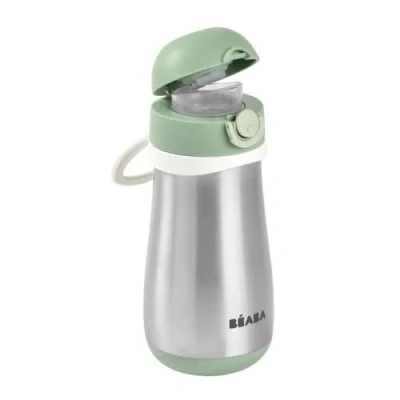 Béaba Stainless Steel Water Bottle for Kids, 2 in 1 Bottle/Glass, Push Button Easy Opening, Durable, Healthy, Removable Handles, Steel, 350ml, Sage Green