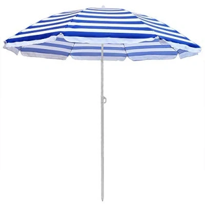 AmazonThis outdoor parasol is Ideal for any setting including the beach, villa, garden or courtyard. Parasol height can be adjusted from 130 to 195cm with flexible stand Lightweight; easy to carry and use / Tilt mechanism provides an adjustable angle to shield you from sun Made of durable steel frame and 140g/m2 fabric / Colours: Blue-White Rib: 8 / Pole: 19/22mmx0.5mm / Arc Length: 180cm Diameter: 160cm / Height: 130-195cm