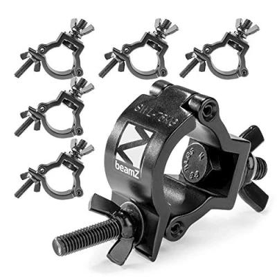 Heavy-duty half coupler clamps crafted from robust aluminium alloy offer secure truss mounting for lighting fixtures, ideal for professional DJs, event organisers, and stage productions. Designed for tubing sizes of 37-40mm diameter and rated with an impressive load capacity of 75kg per clamp, providing peace of mind when mounting spotlights, par cans, and display equipment. Featuring butterfly wingnut tightening for quick setup, effortless adjustments, and versatile positioning; these clamps streamline assembly-time for temporary or permanent lighting rigs. Compact slimline design in a durable black finish ensures discreet installed appearance, blending seamlessly into your stage, truss, or event space without compromising reliability or build quality. Complete set includes 6 BeamZ clamps, each featuring an M10 threaded bolt fixing, enabling compatibility with most standard stage lighting configurations and ensuring maximum stability.
