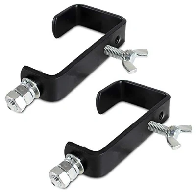 Secure mounting solution featuring two sturdy metal BeamZ lighting clamps for dependable fixture attachment to poles, stands or trussing, ideal for lighting equipment, DJ setups and events. Versatile and adjustable G-clamp design effortlessly accommodates poles up to 50mm in diameter, providing a quick and secure coupling method for lighting fixtures, smoke machines and stage gear. Built from durable metal construction, each clamp safely handles loads of up to 30kg-perfect for both lightweight and heavy-duty disco and stage lighting fixtures in professional event settings. Easy, tool-free operation lets you quickly adjust clamp tension for stable, reliable mounting, making it suited to mobile DJs, touring entertainment companies, venues, and permanent installs. Finished in a sleek, unobtrusive black coating, these mounting hooks blend seamlessly into any lighting rig setup, offering a neat, professional appearance for stages, discos and parties.