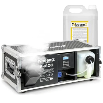Professional DMX Haze Machine with 5L Fluid: The BeamZ F1600 Pro delivers high-quality mist for events and performances, complete with 5L of water-based haze fluid, ensuring immediate use and consistent output. DMX or Stand-Alone Operation: This versatile DMX hazer can be integrated into lighting setups for synchronized effects or used independently for continuous mist production, ideal for various event sizes. Durable Flight Case for Safe Transport: Housed in a sturdy flight case, the BeamZ F1600 Pro is protected from impacts during transport, making it a great choice for mobile DJs and touring professionals. LCD Control Panel for Precise Settings: The LCD control panel allows you to fine-tune haze output, duration, and intervals, giving you full control over the atmosphere and ensuring the perfect effect for every event. Safe, Non-Toxic Haze Fluid: The included 5L of water-based haze fluid is non-toxic and safe for use in enclosed spaces, producing a fine mist without oily residue.