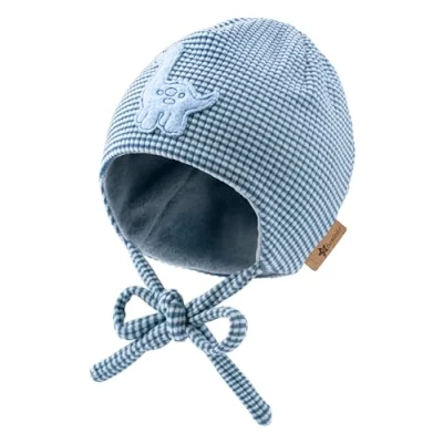 Ribbed design with stripes Features earmuffs and a strap to tie With embroidered dinosaur motif