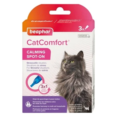IDEAL FOR SHORT-TERM STRESSFUL EVENTS THAT MAKE YOUR CAT NERVOUS: Sometimes unexpected stressful events take us by surprise, such as thunderstorms, fireworks, loud noises, an unexpected car journey or a vet visit. Beaphar CatComfort Calming Spot-On provides comfort and reassurance when your cat needs it the most. BEGINS TO WORK IN 15 MINUTES: Once applied, the spot-on works quickly and will start creating a calming effect around 15 minutes after application. PHEROMONE TECHNOLOGY PROMOTES FEELINGS OF REASSURANCE AND WELL-BEING: Cats communicate through natural messages called pheromones. Beaphar CatComfort Calming Spot-On contains a copy of the Maternal Appeasing Pheromone, MAP, which is instantly recognisable to cats. It is naturally produced by the queen when she nurses her kittens, and is a crucial part of the bonding process, and provides a feeling of calm and a safe space. SUPPORTS HARMONIOUS LIVING: Comforts cats and helps them cope with challenging situations, including when cats are faced with new experiences, such as multi-cat households, social situations, a new family and learning periods. Reduces problem behaviour associated with stress and anxiety, such as scratching, urine spraying, meowing and hiding. SCIENTIFICALLY RECOGNISED: Pheromone technology is widely recognised by behavioural experts and vets for its ability to create an instinctive calming response for your cat. SUITABLE FOR CATS AND KITTENS: Specifically designed for cats of all ages and kittens from the moment they leave the litter. It calms without sedating and does not affect humans or other pets.