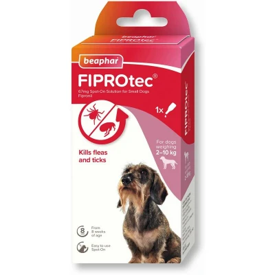 General description Beaphar Fiprotec Spot On Solution for Small Dogs effectively kills fleas and ticks, providing protection for small dogs. It continues to eliminate fleas for up to 5 weeks and ticks for up to 4 weeks, making it an essential part of a regular flea control routine, especially for dogs that spend considerable time outdoors. Technical specifications Suitable for dogs over 12 weeks of age Weight range: 5-10 kg