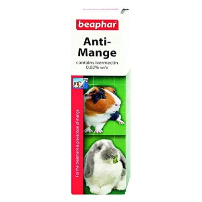 AmazonPack of 3 x 75ml Individually packaged Beaphar Anti-Mange is an approved veterinary medicine containing ivermectin Intended for use on rabbits & guinea-pig Highly recommended for curing pets of the burrowing mites that cause mange Especially popular in Autumn when mange can be prevalent in guinea-pigs
