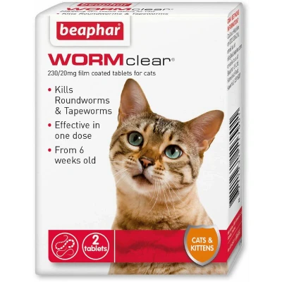 Beaphar WORMclear for Cats is a comprehensive veterinary treatment designed to effectively eliminate roundworms and tapeworms that are commonly found in cats. This product is suitable for cats and kittens from the age of 6 weeks, providing an essential solution for maintaining your pet's health and well-being.