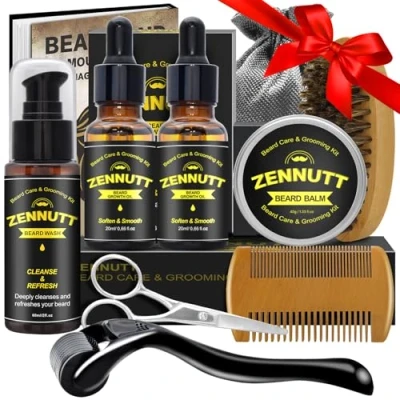 【Beard Wash 】ZenNutt beard kit includes Beard Wash to help you grow your beard easier. The Wash enhances shine and has a pH-balanced formula designed to condition and soften beard. Use the beard Wash which containing natural essential oils, to softly clean your beard and face without stripping skin, leave your beard shinier with a healthy sheen. 【Beard Growth Oil and Balm】ZenNutt beard oil, beard balm are made of high quality Simmondsia Chinensis Seed Oil(Jojoba oil), Argan Spinosa Kernel Oil and Tocopherol(Vitamin E) to prompt beard growth and control dandruff & split ends, Leaves your beard tidy and in good appearance. No more irritation or flakes! 【Beard Brush,Beard Comb,Beard Scissors】Boar bristle brush & Wood comb massages facial hair, stimulates oil absorption & keep hair stay smooth. Sharp scissors offer accurate trimming for beard hair. A perfect groomed beard will give you the confidence to conquer every goal. 【GREAT GIFT CHOICE】Premium packaging makes it ready for sending as a gift for beards man on Birthday, Valentine's Day, Fathers Day, Christmas Day or any other special occasion. Your husband, Dad/father, son or friends will absolutely love this and thanks for this. Works great for any type of beard, long, short, thick or thin. birthday valentines day gifts for him, boyfriend gifts for boyfriend, dad gifts for dad. 【Beard Storage Bag and Beard Care E-book】Portable storage bag organizes your beard products shaving stands easily, Good for travel. The beard e-book tells how to maintain & grow beard fast. Using the kit after daily grooming, even after using the hairdresser brooms & brushes and the beard straightener, aid in healthy beard growth keep you looking damn good!