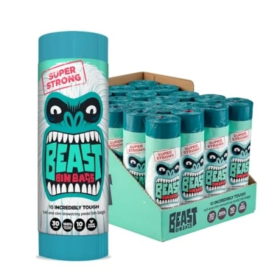 BEAST Bin BAGS, Mega Pack, 20 Rolls of 10 x 30 Litre Bags (Total 200 Bags) Made From 100% Recycled LLDPE Incredibly Strong, Tall and Slim Drawstring Pedal Blue