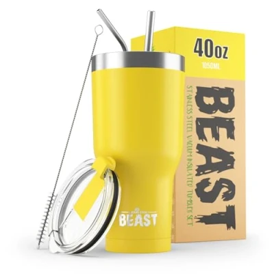 Beast Tumbler 1050 ml (40 oz), Lemon Yellow Reusable Stainless Steel, Vacuum Insulated Cup with + 2 Straws & Cleaning Brush Double Wall Travel Flask Perfect for Hot or Iced Coffee BPA Free