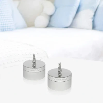 The Beatrix Potter Silver Plated First Tooth and Curl Boxes are the perfect trinket boxes to savour the memories of your little one in a beautifully designed and quality crafted, engraved Peter Rabbit box. They make the perfect gift for a Christening or new parents.With a 3D figurine of Peter Rabbit sat proudly on the top of the lid, and engravings of My First Tooth and My First Curl on the side of the lid, each box is silver plated for a luxurious keepsake.Diameter: 5cm.
