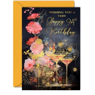 Beautiful Gold 94th Birthday Cards for Women Men Wonderful Golden Cocktails Elegant Traditional Pretty Card 94 Year Old Woman Man Her Him, 5x7 Inch Gorgeous Greeting Gift