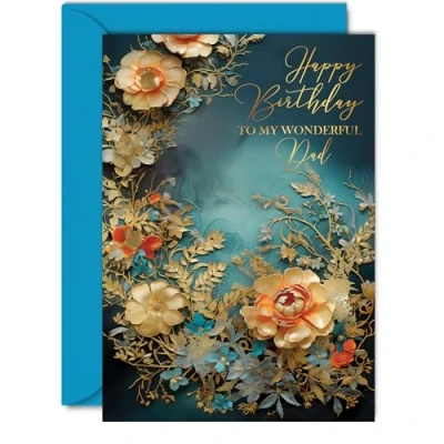 Dazzle your Dad with joy using our exquisite floral Happy Birthday Card Dad; a premium quality masterpiece that features a captivating design of 'Happy Birthday To My Wonderful Dad'. The gold accents on this card make it shine, ensuring it's not just a card but a beautiful keepsake. It's a Personal Gift that shows your Dad how much you care and the perfect way to express your love and appreciation on his special day. What's Inside: Delve into a world of elegance with the inside print showcasing a lovely verse, 'Have a Wonderful Day,' as seen in the second image. There's ample space for your personal message. Crafted on a 360-micron thick, environmentally responsible board, this one-sided gloss board offers a luxurious look and feel. Paired with a colored gummed envelope that complements the design, it's ready to be sealed and sent, making it a truly special birthday gesture. Ink Perfection: Say goodbye to ink smudges! Our high-quality one-sided coated board ensures a smooth writing experience without the worry of smudging. The uncoated side absorbs ink, providing a flawless finish that adds to the card's overall premium quality. Dimensions that Impress: Greet with grandeur using a card sized at 148mm x 210mm, accompanied by an envelope measuring 150mm x 212mm. The card boasts a thickness of 360 microns, ensuring a substantial and impressive presence. British Craftsmanship: Proudly crafted and quality-checked in the UK, our birthday cards are a testament to expert design and manufacturing. Utilizing Forest Stewardship Council certified board, we contribute to responsible forest management. Expect a swift turnaround and a product that reflects the highest standards of quality.