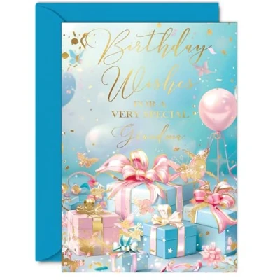 Dazzle your Grandma with joy using our exquisite Happy Birthday Card Grandma; a premium quality masterpiece that features a captivating design of "Wishing You A Fantastic Birthday Grandma" The gold accents on this card make it shine, ensuring it's not just a card but a beautiful keepsake. It's a Personal Gift that shows your Grandma how much you care and the perfect way to express your love and appreciation on her special day. What's Inside: Delve into a world of elegance with the inside print showcasing a lovely verse, 'Have a Lovely Day' as seen in the second image. There's ample space for your personal message. Crafted on a 360-micron thick, environmentally responsible board, this one-sided gloss board offers a luxurious look and feel. Paired with a colored gummed envelope that complements the design, it's ready to be sealed and sent, making it a truly special birthday gesture. Ink Perfection: Say goodbye to ink smudges! Our high-quality one-sided coated board ensures a smooth writing experience without the worry of smudging. The uncoated side absorbs ink, providing a flawless finish that adds to the card's overall premium quality. Dimensions that Impress: Greet with grandeur using a card sized at 148mm x 210mm, accompanied by an envelope measuring 150mm x 212mm. The card boasts a thickness of 360 microns, ensuring a substantial and impressive presence. British Craftsmanship: Proudly crafted and quality-checked in the UK, our birthday cards are a testament to expert design and manufacturing. Utilizing Forest Stewardship Council certified board, we contribute to responsible forest management. Expect a swift turnaround and a product that reflects the highest standards of quality.