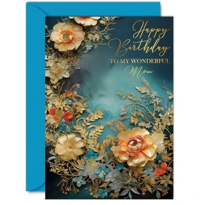 Beautiful Gold Birthday Cards for Mom Wonderful Golden Flowers Elegant Traditional Pretty Card from Son Daughter, 5x7 Inch Mother Gorgeous Greeting Gift