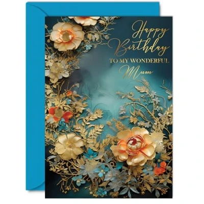 Dazzle your Mum with joy using our exquisite floral Happy Birthday Card Mum; a premium quality masterpiece that features a captivating design of 'Happy Birthday To My Wonderful Mum'. The gold accents on this card make it shine, ensuring it's not just a card but a beautiful keepsake. It's a Personal Gift that shows your Mum how much you care and the perfect way to express your love and appreciation on her special day. What's Inside: Delve into a world of elegance with the inside print showcasing a lovely verse, 'Have a Wonderful Day,' as seen in the second image. There's ample space for your personal message. Crafted on a 360-micron thick, environmentally responsible board, this one-sided gloss board offers a luxurious look and feel. Paired with a colored gummed envelope that complements the design, it's ready to be sealed and sent, making it a truly special birthday gesture. Ink Perfection: Say goodbye to ink smudges! Our high-quality one-sided coated board ensures a smooth writing experience without the worry of smudging. The uncoated side absorbs ink, providing a flawless finish that adds to the card's overall premium quality. Dimensions that Impress: Greet with grandeur using a card sized at 127mm x 178mm, accompanied by an envelope measuring 130mm x 180mm. The card boasts a thickness of 360 microns, ensuring a substantial and impressive presence. British Craftsmanship: Proudly crafted and quality-checked in the UK, our birthday cards are a testament to expert design and manufacturing. Utilizing Forest Stewardship Council certified board, we contribute to responsible forest management. Expect a swift turnaround and a product that reflects the highest standards of quality.