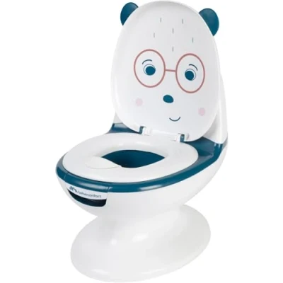 BABY & TODDLER POTTY TOILET: the Mini Size Toilet is suitable for ages from 12 months to 3 years old, it can be used for the entire potty-training period LIFELIKE STYLE: despite the small size, the toilet potty has all the makings of a big one, from the lift-up cover and seat to the baby-wipes compartments, encouraging the baby to use it REAL FLUSH SOUND: teaching your little one to use the toilet will be an easier task when he realises how entertaining it can be to flush his own toilet like a grown-up CUTE BEAR DESIGN: potty training is an important stage in life, and there is no better way to do it than with a playful and cute design that will make potty training nothing but fun EASY TO CLEAN: thanks to its removable bowl, cleaning the Mini Size Toilet is trouble-free - in only 3 effortless steps, the potty is sanitised and ready to be used again SPLASH GUARD: the Mini Size Toilet is the perfect potty for both boys and girls due to the splash guard included, which assures less spills and more hygiene for your baby RUBBER FOOT: the light weight of this kids potty training toilet makes it great to carry around wherever you go while its rubber foot ensures more safety and comfort when using the potty