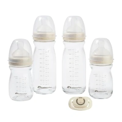 Bebeconfort Physio Air Care Glass Bottle Kit, Anti Colic Baby Bottles, Newborn Essentials, 0+ Months, Includes 4 Feeding Bottles and a Soother, Physiological Shaped Soother Silicone Teats