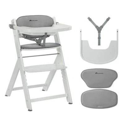 Bebeconfort Timba 2 with Cushion, Evolutive Wooden Highchair, 6+ Months, Up to 110 kg, Ergonomic Baby High Chair, Fits Most Dining Tables, Removable Tray, White + Grey