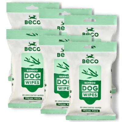 Beco Dog Wipes Plastic Free, 20 x 6 Travel Packs, Unscented, For Paws, Body & Bum, Plant Based Grooming