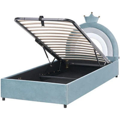 Rainbow Headboard Upholstered Bed. Bring a touch of magic to your child’s room with this adorable single bed. The rainbow-shaped headboard with a playful crown detail adds a whimsical charm, perfect for little dreamers. Upholstered in soft velvet for a cosy feel, it offers both comfort and style. Supported by sturdy synthetic legs, this bed is designed to be both durable and enchanting. What is more, the bed features ample storage space, perfect for keeping extra pillows or blankets organised. Details: Product Type: Kids Bed General Color: Blue, Black Material Type: Fabric Main Material: Velvet Additional Material: Synthetic Material Material Composition: 100% Polyester Fabric Upholstered Back: No Storage Type: Ottoman Storage: Yes Dimensions: Headrest Dimensions: 96x77 Width: 97 cm Storage Dimensions: 91x201x20 Length: 210 cm Height: 106 cm Sleeping Surface: 90x200 cm Weight: 36 kg Weight Capacity: 150 kg Offer Includes: 1 x Slatted Frame (15 Sprung Slats), 1 x Bed Frame, Not
