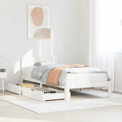 ManoManoGeneral description Get a better restful night's sleep with this stylish bed frame! It makes a welcoming addition to any bedroom, combining functionality with a rustic charm. Technical specifications Colour: White Material: Solid pinewood Overall dimensions: 205.5 x 93.5 x 69.5 cm (L x W x H) Sleeping height from the ground: 25.5 cm Suitable mattress size: 90 x 200 cm (W x L) (mattress not included) Slat material: Plywood Drawer outer dimensions: 90 x 55 x 17 cm (W x D x H) Drawer inner dimensions: 81.5 x 52.5 x 10 cm (W x D x H) Max. load capacity (each drawer): 20 kg Compatibility and accessories A mattress is not included with this bed. Various selections of mattresses are available in our shop. Installation Assembly required: Yes Usage Equipped with a slatted base for optimal support and breathability for your mattress. Features two drawers underneath for extra storage space, perfect for items like bedding, seasonal clothing, and toys. Includes a versatile headboard that provides