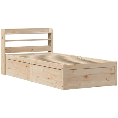 ManoManoGeneral description Get a better restful night's sleep with this bed frame! It makes a welcoming addition to any bedroom. The stable and long-lasting frame is made from solid pinewood, known for its strength and durability, while its straight grains and distinctive knots contribute to its rustic charm. The bed frame features a slatted base for optimal support and breathability for your mattress. Technical specifications Material: Solid pinewood (untreated) Slat material: Plywood Overall dimensions: 209 x 100 x 82 cm (L x W x H) Suitable mattress size: 90 x 190 cm Single (W x L) (mattress not included) With storage shelves Assembly required: Yes Delivery contains: 1 x Bed frame 1 x Headboard Other information