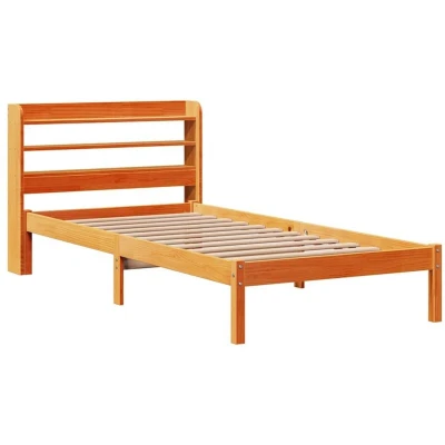 ManoManoGeneral description Enjoy a good night's sleep in this wooden bed frame! It makes a practical and decorative addition to your interior. The bed frame is made of solid pine wood, which is a beautiful natural material with a straight grain and rustic knots. It ensures sturdiness and stability, while the plywood slats provide good weight distribution, keeping the mattress in place during sleep. The versatile headboard offers excellent back support for reading or watching TV and features two convenient shelves for ample storage of nighttime essentials. Technical specifications Colour: Wax brown Bed frame material: Solid pine wood Slat material: Plywood Overall dimensions: 208 x 85 x 82 cm (L x W x H) Suitable mattress size: 75 x 190 cm Small Single (W x L) (mattress not included) Headboard dimensions: 85 x 16 x 82 cm (L x W x H) With storage shelves Assembly required: Yes Delivery contains: 1 x Bed frame, 1 x Headboard SKU: 3306551 Other information