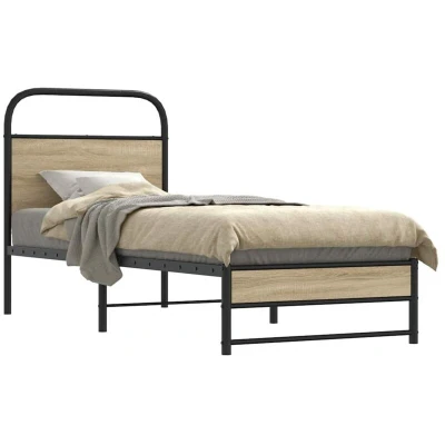 ManoManoGeneral description If you are looking for a robust bed frame for your bedroom, then this classic bed frame featuring an elegant and timeless design is the perfect choice for you! Made from steel, this bed frame offers exceptional sturdiness and stability, supported by stable and durable legs. The versatile headboard provides excellent back support when sitting up in bed, making it ideal for reading or watching TV, while also serving as a decorative element. The slatted base ensures optimal support and breathability for your mattress. Technical specifications Colour: Smoked oak Material: Steel, engineered wood Overall dimensions: 196 x 80 x 100 cm (L x W x H) Clearance height under the bed: 27 cm Suitable mattress size: 75 x 190 cm (W x L) (mattress not included) With headboard Assembly required: Yes Other information SKU: 4100364