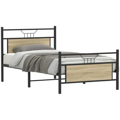 ManoManoGeneral description Get a better restful night's sleep with this stylish bed frame! The Sonoma oak finish makes it a welcoming addition to any bedroom. This bed frame features a stable and long-lasting construction, ensuring durability and support for years to come. Technical specifications Colour: Sonoma oak Material: Engineered wood and steel Overall dimensions: 207 x 113 x 91.5 cm (L x W x H) Clearance height under the bed: 27 cm Suitable mattress size: 107 x 203 cm (W x L) (mattress not included) With headboard and footboard Assembly required: Yes Usage The headboard and footboard keep your mattress in place. The headboard provides excellent back support for reading or watching TV in bed. Extra storage space underneath the bed is perfect for keeping storage boxes out of sight. The slatted base offers optimal support and breathability for your mattress. Other information