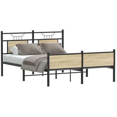 General description Get a better restful night's sleep with this stylish bed frame! The Sonoma Oak finish makes it a welcoming addition to any bedroom. The frame is designed for stability and durability, ensuring a long-lasting use. Technical specifications Colour: Sonoma oak Material: Engineered wood and steel Overall dimensions: 196 x 142.5 x 91.5 cm (L x W x H) Clearance height under the bed: 27 cm Suitable mattress size: 137 x 190 cm (W x L) (mattress not included) With headboard and footboard Assembly required: Yes Usage Stable and long-lasting frame: The steel construction provides strength and stability. Functional headboard and footboard: Keeps your mattress in place and offers excellent back support for sitting up in bed. Extra storage space: The bed base features additional space underneath for storing boxes out of sight. Slatted base for optimal support: The metal frame includes a slatted base for enhanced support and breathability for your mattress. Other information