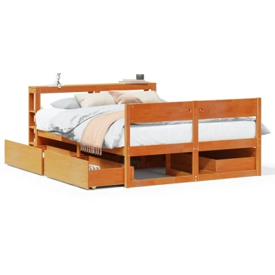 ManoManoGeneral description Get a better restful night's sleep with this stylish bed frame! It makes a welcoming addition to any bedroom, combining functionality with rustic charm. Technical specifications Colour: Wax brown Material: Solid pinewood Slat material: Plywood Overall dimensions: 214.5 x 141 x 82 cm (L x W x H) Suitable mattress size: 135 x 190 cm Double (mattress not included) Drawer dimensions: 90.5 x 47 x 25.5 cm (L x W x H) Assembly required: Yes Compatibility and accessories A mattress is not included with this bed. A variety of mattresses are available in our shop. Installation Assembly is required for this bed frame. Usage The bed frame features a slatted base for optimal support and breathability for your mattress. It includes four drawers underneath for storage of items like extra bedding, seasonal clothing, and toys. The sleek headboard features two convenient shelves for easy access to nighttime essentials. The freestanding headboard allows for effortless placement and