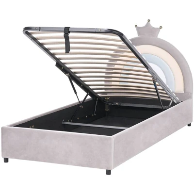 Rainbow Headboard Upholstered Bed. Bring a touch of magic to your child’s room with this adorable single bed. The rainbow-shaped headboard with a playful crown detail adds a whimsical charm, perfect for little dreamers. Upholstered in soft velvet for a cosy feel, it offers both comfort and style. Supported by sturdy synthetic legs, this bed is designed to be both durable and enchanting. What is more, the bed features ample storage space, perfect for keeping extra pillows or blankets organised. Details: Product Type: Kids Bed General Color: Grey, Black Material Type: Fabric Main Material: Velvet Additional Material: Synthetic Material Material Composition: 100% Polyester Fabric Upholstered Back: No Storage Type: Ottoman Storage: Yes Dimensions: Headrest Dimensions: 96x77 Width: 97 cm Storage Dimensions: 91x201x20 Length: 210 cm Height: 106 cm Sleeping Surface: 90x200 cm Weight: 36 kg Weight Capacity: 150 kg Offer Includes: 1 x Slatted Frame (15 Sprung Slats), 1 x Bed Frame, Not