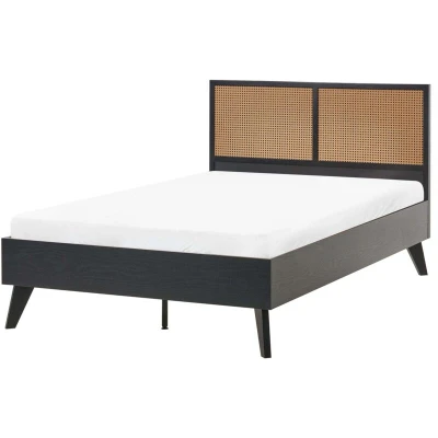 Modern Bed with PE Rattan Headboard. Treat yourself to a unique sleeping environment, which is not only comfortable but also very trendy and sleek. This modern bed frame, made of high-quality particle board, features a visible wood texture for a more natural feel and rubberwood legs for stability. The pe rattan headboard decorated with viennese braid adds a boho touch to the piece. Pair it with other accessories in neutral earthy tones to create a marvellous composition that will help you to relax and enjoy a good night's sleep. Details: Product Type: Double Bed General Color: Black, Brown Material Type: Rattan Main Material: Particle Board Additional Material: Rubberwood Fabric Upholstered Back: Yes Finish: Lacquered Dimensions: Headrest Dimensions: 125x59 Width: 125 cm Length: 208 cm Height: 99 cm Sleeping Surface: 120x200 cm Weight: 42 kg Weight Capacity: 200 kg Offer Includes: 1 x Bed Frame, 1 x Slatted Frame (32 Sprung Slats), Not Included: Mattress, Bedding and Cushions Key