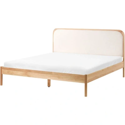 General description This minimalistic wooden bed frame with headboard is crafted from solid pine wood, ensuring durability and a stylish appearance. The natural wood grain pattern adds a welcoming vibe, making it an ideal choice for modern interiors. The rounded upholstered headboard provides a comfortable spot for leaning back while reading or watching TV. Technical specifications Product Type: Double Bed Style: Minimalist General Color: Brown Shade: Light Brown Main Material: Pine Wood Additional Material: Fabric (100% Polyester) Dimensions: Width: 166 cm, Length: 208 cm, Height: 100 cm Headrest Dimensions: 166x100 cm Sleeping Surface: 160x200 cm Weight: 36 kg Weight Capacity: 240 kg Finish: Lacquered Installation Full assembly required Estimated assembly time: 20-40 minutes Usage Suitable for all types of mattresses Even distribution of body weight Natural wood grains and knots make each piece unique Other information Maintenance tips: Clean with a mild cleaner and a soft cloth in