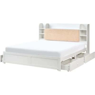 Bed Frame with a Shelving Display. This elegant bed is not only practical but also adds a modern touch to your bedroom. With its four drawers, two on each side, you have plenty of storage for clothes, shoes, or accessories, that can be easily organised to keep your room in order. The built-in shelves on the headboard allow for easy access to your books or decor, all while keeping your space neat and tidy, offering both utility and style. Details: Product Type: Double Bed General Color: White, Beige Material Type: Engineered Wood Main Material: MDF Additional Material: Boucle Material Composition: 100% Polyester Fabric Upholstered Back: Yes Finish: Melamine Number of Drawers: 4 Storage Type: Drawers Storage: Yes Dimensions: Headrest Dimensions: 188x110 Width: 188 cm Storage Dimensions: 84x39x10 Length: 227 cm Height: 110 cm Sleeping Surface: 180x200 cm Weight: 82 kg Weight Capacity: 150 kg Drawer Weight Capacity: 10 kg Offer Includes: 1 x Bed Frame with Storage, 1 x Slatted Frame (15