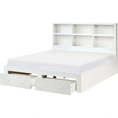Bed Frame with Bookcase Headboard. A practical and stylish bed that makes the most of your space, featuring two handy drawers underneath for easy storage of bedding or other essentials. The headboard shelves offer a convenient place for your favourite books or decorative pieces. Its simple yet elegant design suits a range of interiors, making it a perfect choice for a contemporary bedroom. Details: Product Type: Double Bed General Color: White Material Type: Engineered Wood Main Material: MDF Additional Material: Plywood Storage Material: MDF Fabric Upholstered Back: Yes Finish: Melamine Number of Drawers: 2 Storage Type: Drawers Storage: Yes Dimensions: Headrest Dimensions: 184x125 Width: 184 cm Storage Dimensions: 70x36x13 Length: 220-260 cm Height: 125 cm Sleeping Surface: 180x200 cm Weight: 81 kg Weight Capacity: 150 kg Drawer Weight Capacity: 10 kg Offer Includes: 1 x Bed Frame with Storage, 1 x Slatted Frame (15 Rolled Slats), 2 x Storage Drawer, Not Included: Mattress, Bedding
