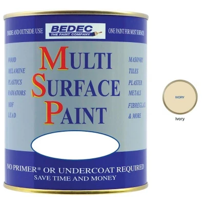 General description BEDEC MULTI SURFACE PAINT MSP is a versatile, water-based paint known for its outstanding flexibility, which prevents flaking or peeling. It can be applied over most existing paints and varnishes, including weathered Tar Varnish, Bitumen, and Creosote. This non-yellowing paint is easy to clean up with water and is suitable for a wide range of surfaces. Technical specifications Type: Water-based paint Volume: 2.5L Heat resistance: Up to 80ºC Recoatable after: 4 hours Low VOC Microporous and breathable Non-flammable Compatibility and accessories Can be used on: Wood, MDF, Metals, Plastics, Tiles, Radiators, and more No primer or undercoat needed, except on mild steel (use BEDEC Metal Primer) where staining can occur (use BEDEC Stain Block) Usage Suitable for both interior and exterior applications Resists flaking and cracking Retains gloss for longer Chalks much less Only water is needed for thinning and cleaning