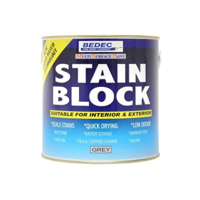 General description BEDEC STAIN BLOCK is a versatile paint suitable for both interior and exterior applications. It features an effective blocking action against various stains including nicotine, water stains, marker pen, crayon, tea and coffee stains, and smoke. This unique product combines traditional and modern technology to create a water-based solution that prevents bleed-through, ensuring a clean finish on new paintwork. Technical specifications Volume: 750ml Coverage: Approximately 12-14 sq metres/litre per coat when applied by brush or roller, depending on the texture and porosity of the substrate. Quick drying Low odour Excellent flow Non-yellowing