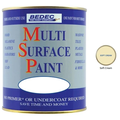 General description BEDEC MULTI SURFACE PAINT MSP is a versatile, water-based paint known for its outstanding flexibility, which helps it resist flaking and peeling. This non-yellowing paint can be applied directly onto a wide range of surfaces without the need for a primer or undercoat, making it an efficient choice for both interior and exterior projects. Technical specifications Volume: 750ml Heat resistance: up to 80ºC Recoatable after: 4 hours Low VOC Water-based Non-flammable Compatibility and accessories Can be used on: Wood, MDF, Metals, Plastics, Tiles, Radiators, and more Compatible with weathered Tar Varnish, Bitumen, and Creosote For mild steel, use BEDEC Metal Primer if staining can occur For areas prone to staining, use BEDEC Stain Block Usage Suitable for interior and exterior applications Resists flaking and cracking Retains gloss for longer Chalks much less Cleans up easily with water No special thinners required, only water