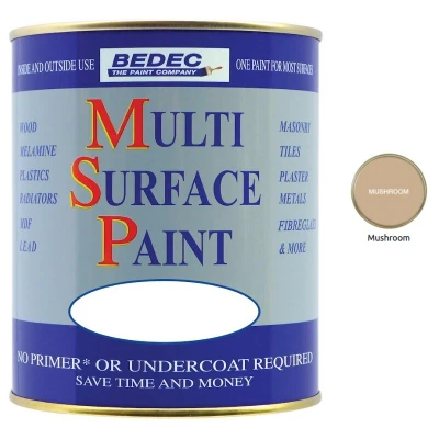 General description BEDEC MULTI SURFACE PAINT MSP is a versatile, water-based paint known for its outstanding flexibility, which helps resist flaking and peeling. This non-yellowing paint can be applied directly onto a wide range of surfaces without the need for a primer or undercoat, making it an efficient choice for both interior and exterior applications. Technical specifications Volume: 750ml Heat resistance: up to 80ºC Recoatable after: 4 hours Low VOC Water-based Non-flammable Compatibility and accessories Can be used on: Wood, MDF, Metals, Plastics, Tiles, Radiators, and more Compatible with weathered Tar Varnish, Bitumen, and Creosote For mild steel, use BEDEC Metal Primer if staining can occur For staining issues, use BEDEC Stain Block Usage Suitable for interior and exterior use Resists flaking and cracking Retains gloss for longer Chalks much less Cleans up easily with water No special thinners required (only water)