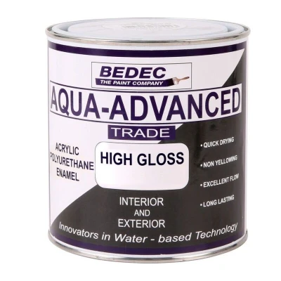 General description BEDEC AQUA ADVANCED GLOSS is a high-quality, quick-drying, non-yellowing Acrylic/Polyurethane Enamel suitable for both interior and exterior use. It features excellent durability, levelling, and colour retention, providing a smooth enamel finish in gloss and satin. Technical specifications Type: Acrylic/Polyurethane Enamel Finish: Gloss and Satin Coverage: Approximately 13-15 sq metres/litre per coat when applied by brush or roller, depending on the texture and porosity of the substrate