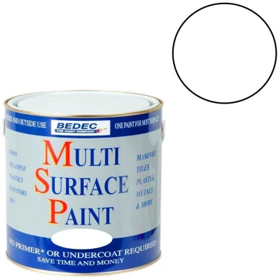 General description BEDEC MULTI SURFACE PAINT MSP is a versatile, water-based paint designed to resist flaking and peeling due to its exceptional flexibility. It can be applied over most existing paints and varnishes, including weathered Tar Varnish, Bitumen, and Creosote. This non-yellowing paint is easy to clean up with water and is suitable for a wide range of surfaces. Technical specifications Type: Water-based paint Finish: Satin Volume: 2.5L Heat resistance: Up to 80ºC Recoatable after: 4 hours Low VOC Microporous and breathable Non-flammable Compatibility and accessories Can be used on: Wood, MDF, Metals, Plastics, Tiles, Radiators, and more Compatible with most old paints (no primer required unless on mild steel) For mild steel: Use BEDEC Metal Primer For staining issues: Use BEDEC Stain Block Usage BEDEC MULTI SURFACE PAINT is suitable for both interior and exterior applications. It is designed to save time and money while providing a durable finish that resists flaking and