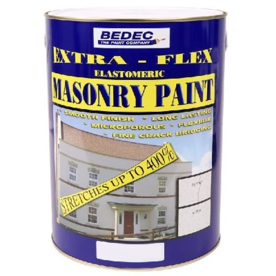 General description Bedec Extra-Flex Masonry Paint in Brilliant White is an elastomeric paint designed for the protection of various exterior surfaces including masonry, roughcast, pebble-dash, brickwork, cement, and concrete rendered surfaces. This water-based, quick-drying paint stretches up to 400% to accommodate substrate movement, making it ideal for preventing cracking that can occur with conventional masonry paints. Technical specifications Type: Modified acrylic blend Finish: Smooth Coverage: Approximately 9-11 sq meters/litre per coat (application by brush or roller) Compatibility and accessories Can be applied to previously painted surfaces after suitable preparation Usage Apply with brushes, rollers, or spray