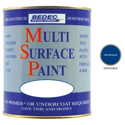 General description BEDEC MULTI SURFACE PAINT MSP is a versatile, water-based paint known for its outstanding flexibility, which helps prevent flaking or peeling. It can be applied over most existing paints and varnishes, including weathered Tar Varnish, Bitumen, and Creosote. This non-yellowing paint is easy to clean up with water and is suitable for a wide range of surfaces. Technical specifications Type: Water-based paint Heat resistance: Up to 80ºC Recoatable after: 4 hours Low VOC Microporous and breathable Non-flammable Compatibility and accessories Can be used directly on: Plastic, wood, metal (including radiators), plastic coated steel, cladding, brick, masonry, fibreglass, terracotta, stone, plaster, MDF, tiles, melamine, UPVC, galvanised steel, aluminium, copper, and more. No primer or undercoat needed, except on mild steel (use BEDEC Metal Primer) where staining can occur (use BEDEC Stain Block). Usage Suitable for both interior and exterior applications. Resists flaking