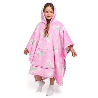 Bedlam, kids, children, girls, boys poncho, fleece hoodie, wearable throw, Polyester, Unicorn Pink, 75 x 92.5cm