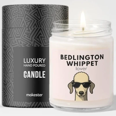 Bedlington Whippet Gifts Luxury Soy Wax Candle Vanilla, Jasmine, Sugared Almond Dogs in Shades Makester