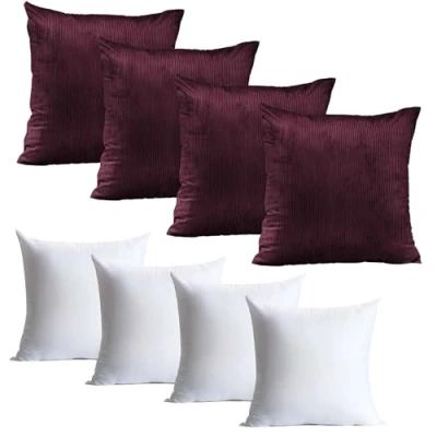 BedLooms Cushions with Covers Included 45 x Cm Set of 8 (4 Burgundy Cushion Covers, 4 Inserts) Striped Velvet Square Throw Pillows Decorative Sofa Invisible Zipper 18x18 Inch