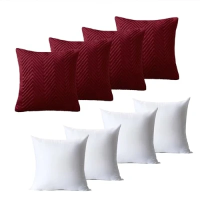 BedLooms Cushions with Covers Included 45 x cm Set of 8 (4 Burgundy Cushion Covers, 4 Inserts) Ultrasonic Square Throw Pillow Cases Decorative Sofa Invisible Zipper