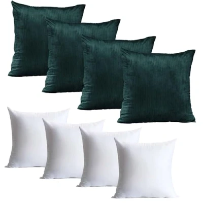 SET INCLUDES: Set of 8 Pcs (4 Cushion Covers & 4 Cushion Inserts) 45 x 45 cm. These Cushion covers are available in multiple colour schemes that match every bedding. (18 x 18 Inches). HIDDEN ZIPPER: Insert and remove your cushions ease with the invisible zip that is installed at the bottom of the hem, which allows better handling and whole cushion cover looks more beautiful. ELEGANT MATERIAL: Made of high-quality breathable velvet material, our plush cushion covers & inners/inserts are soft and pleasant to the touch. We stitch them perfectly to ensure no loose threads or frayed edges. They will not shed feathers or fur after washing and can last for years. DESIGN & TEXTURE: This beautiful cozy throw cushion cover & inners/inserts can bring you a sense of luxury and elegance, it is made up of high-grade velvet with a classy design and look, perfectly suited for a sofa, bed, living room, Car, home and office. EASY TO CARE: These square throw pillow covers are machine washable for easy care. Don’t bleach. Don’t iron. Don’t dry clean and it'll look brand new, Wash with similar colours.